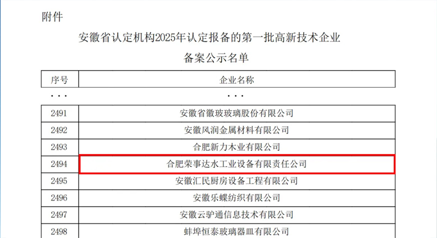 合肥榮事達水工業(yè)設(shè)備有限責(zé)任公司通過高新技術(shù)企業(yè)認定,榮獲由安徽省工業(yè)和信息化廳、安徽省財政廳、國家稅務(wù)總局安徽省稅務(wù)局聯(lián)合頒發(fā)的《高新技術(shù)企業(yè)證書》,這一認可,標志著公司在技術(shù)創(chuàng)新、成果轉(zhuǎn)化及核心競爭力建設(shè)方面邁上新臺階。